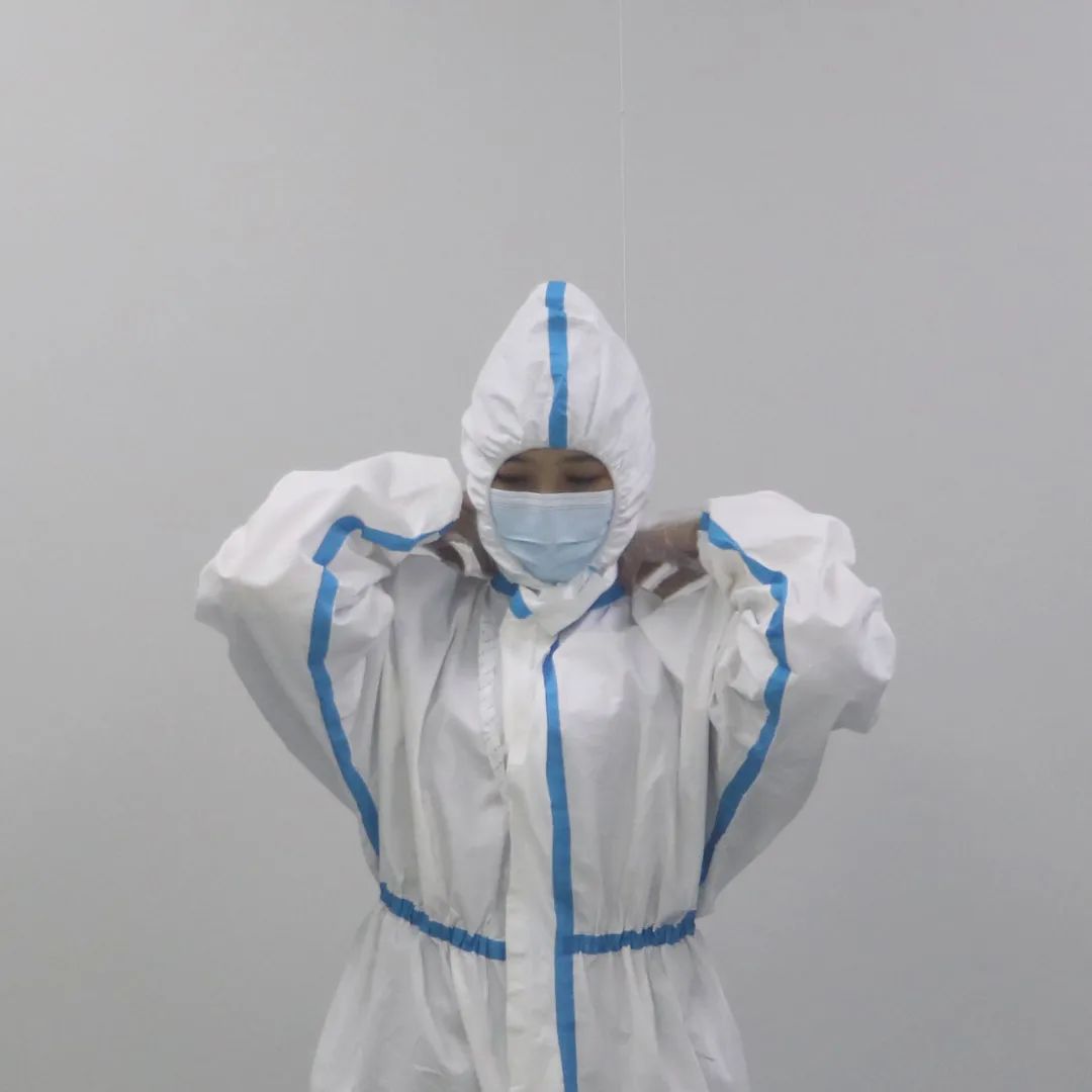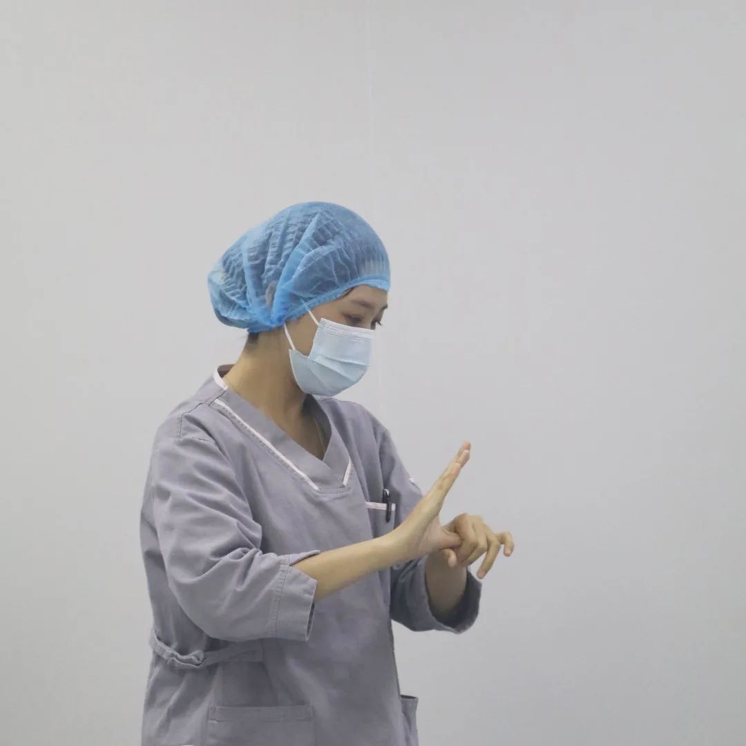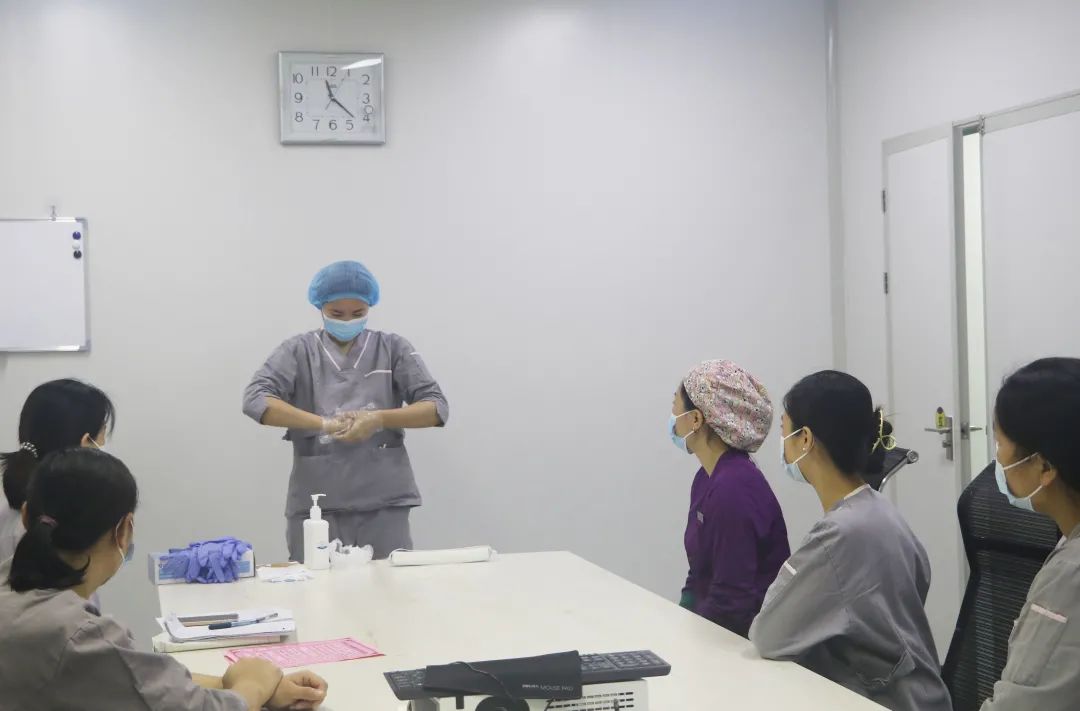 考核現場員工一一進行隔離衣穿脫,部門負責人以及教學組長進行點評,并對其中穿脫不合規的地方進行指導,以真正達到培訓目的。