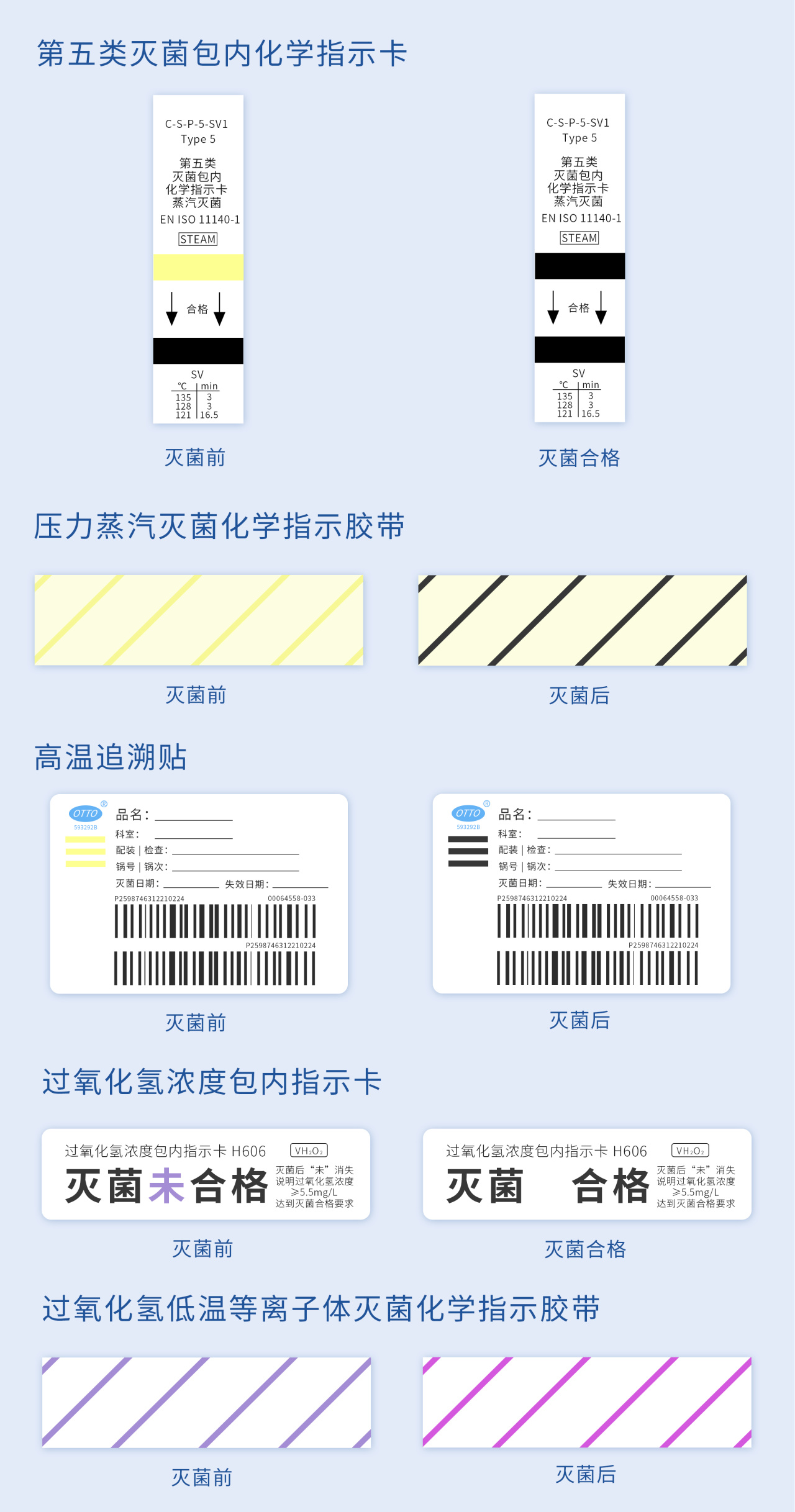 目前國濟尚領消毒供應中心高溫無菌包采用第五類滅菌包內化學指示卡、壓力蒸汽滅菌化學指示膠帶及高溫追溯貼,低溫無菌包采用過氧化氫濃度包內指示卡、過氧化氫低溫等離子體滅菌化學指示膠帶及低溫追溯貼。